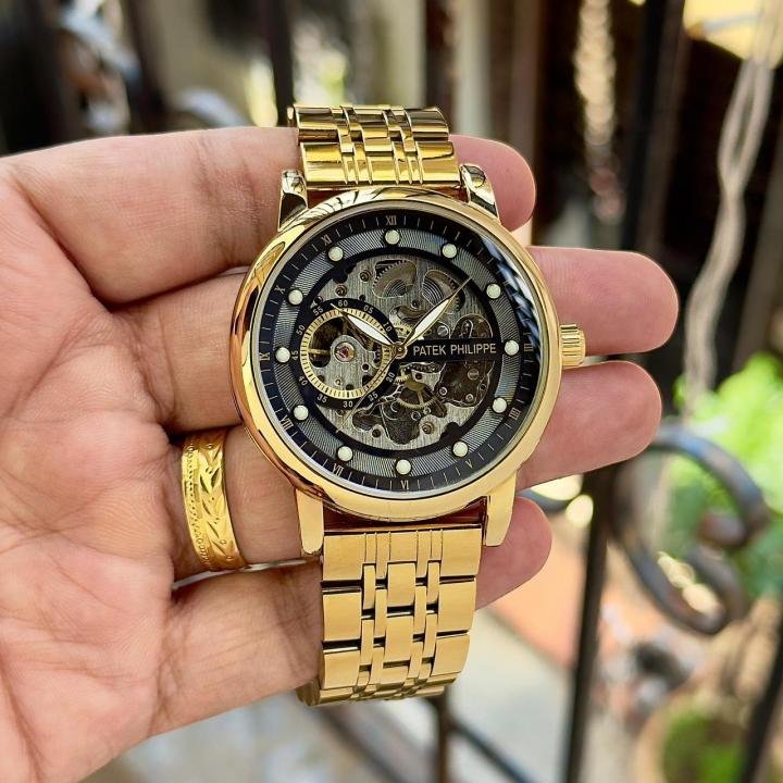 Patek Philippe Black Skeleton Dial Automatic Metal Strap Luxury Watch
