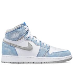 White/blue leather/rubber Air Jordan 1 High OG sneakers from Jordan Kids featuring signature Air Jordan Wings logo, signature Swoosh logo detail, contrasting panel detail, round toe, front lace-up fastening, logo patch at the tongue, ankle-length, branded insole and rubber sole. These styles are supplied by a premium sneaker marketplace. Stocking only the most sought-after footwear, they source and curate some of the most hard to find sneakers from around the world..