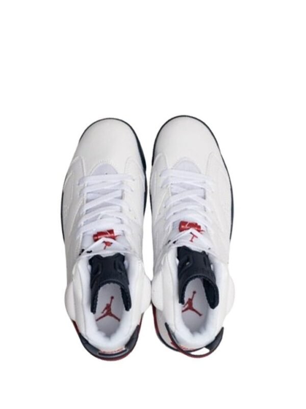 The Jordan Retro 6 sneaker in white, navy, and red offers a classic and stylish look. With its durable construction and iconic design, it provides both comfort and nostalgia for sneaker enthusiasts. Perfect for everyday wear or a special occasion, this shoe delivers on both style and performance.