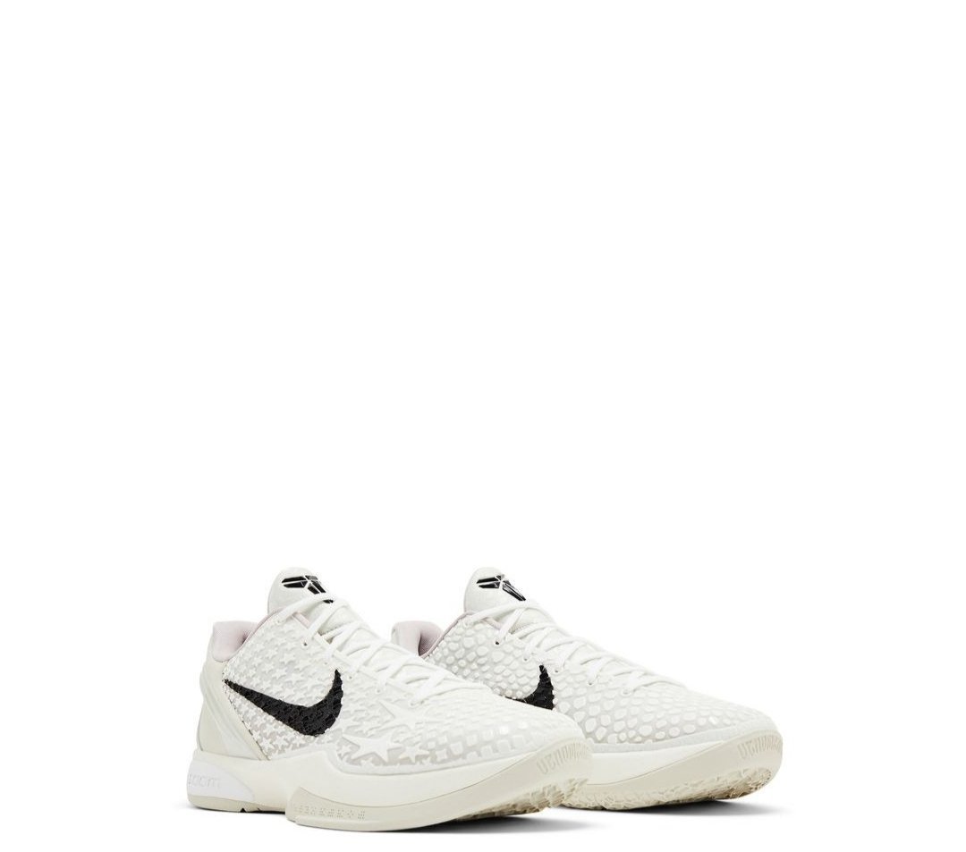 The Nike Zoom Kobe 6 Protro ‘Sail’, also known as ‘All-Star 2.0’, features an off-white textile upper covered in an array of raised polyurethane stars on the lateral side. The medial side displays the scaly snakeskin pattern for which the Kobe 6 is known. A floating black Swoosh adorns the side panel, matching Kobe’s signature shield logo atop the tongue. Updated performance benefits include a full-length Cushlon midsole with a large and flexible Zoom Turbo unit in the forefoot.