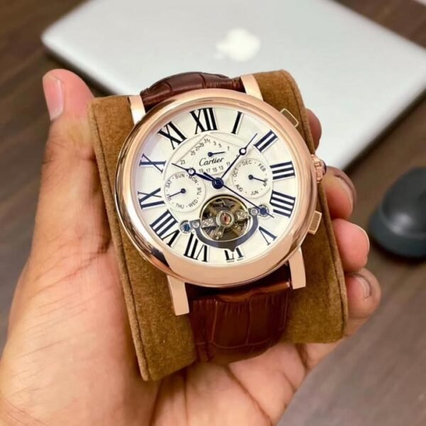Cartier Rose Gold Open Heart Automatic Calendar Leather Strap Watch